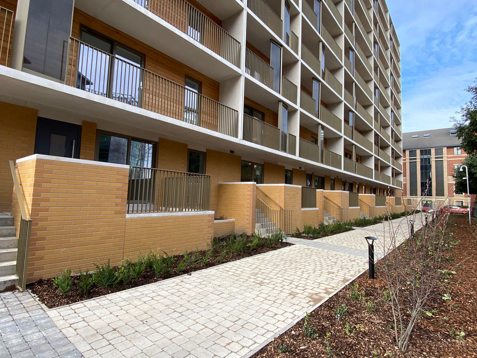The brief called for the creation of landscaped podium gardens above on site car parking, with access routes designed for pedestrians rather than heavy materials.
